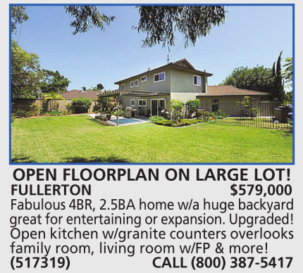 FULLERTON $579,000 Fabulous 4BR, 2.5BA home w/a huge backyard great for entertaining or expansion. Upgraded! Open kitchen w/granite counters overlooks family room, living room w/FP & more! (517319) CALL (800) 387-5417