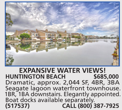 HUNTINGTON BEACH $685,000 Dramatic, approx. 2,044 SF, 4BR, 3BA Seagate lagoon waterfront townhouse.
