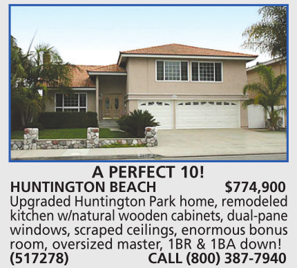 HUNTINGTON BEACH $774,900 Upgraded Huntington Park home, remodeled kitchen w/natural wooden cabinets, dual-pane windows, scraped ceilings, enormous bonus room, oversized master, 1BR & 1BA down! (517278) CALL (800) 387-7940