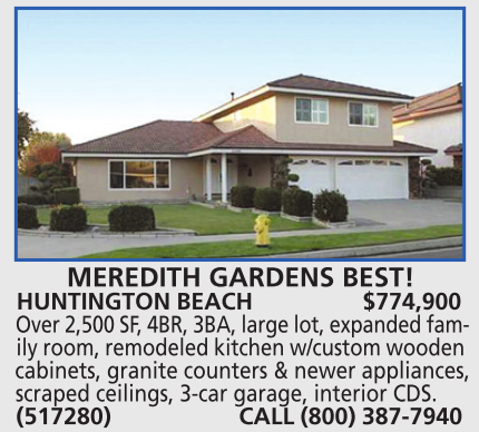 MEREDITH GARDENS BEST! HUNTINGTON BEACH $774,900 Over 2,500 SF, 4BR, 3BA, large lot, expanded family room, remodeled kitchen w/custom wooden cabinets, granite counters & newer appliances, scraped ceilings, 3-car garage, interior CDS. (517280) CALL (800) 387-7940