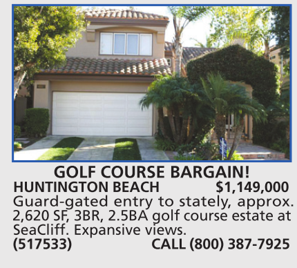 HUNTINGTON BEACH $1,149,000 Guard-gated entry to stately, approx. 2,620 SF, 3BR, 2.5BA golf course estate at SeaCliff. Expansive views. (517533) CALL (800) 387-7925