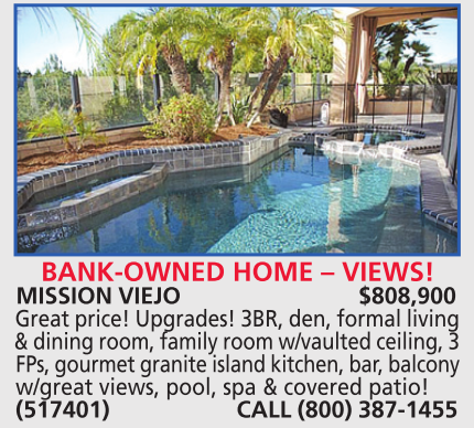 BANK-OWNED HOME – VIEWS! MISSION VIEJO $808,900 Great price! Upgrades! 3BR, den, formal living & dining room, family room w/vaulted ceiling, 3 FPs, gourmet granite island kitchen, bar, balcony w/great views, pool, spa & covered patio! (517401) CALL (800) 387-1455