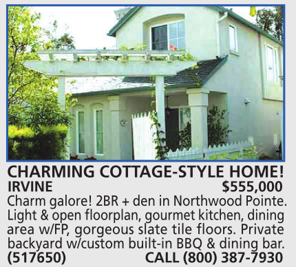 CHARMING COTTAGE-STYLE HOME! IRVINE $555,000 Charm galore! 2BR + den in Northwood Pointe. Light & open floorplan, gourmet kitchen, dining area w/FP, gorgeous slate tile floors. Private backyard w/custom built-in BBQ & dining bar. (517650) CALL (800) 387-7930