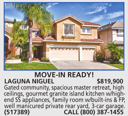 MOVE-IN READY! LAGUNA NIGUEL $819,900 Gated community, spacious master retreat, high ceilings, gourmet granite island kitchen w/highend SS appliances, family room w/built-ins & FP, well manicured private rear yard, 3-car garage. (517389) CALL (800) 387-1455