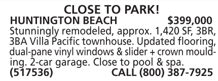 HUNTINGTON BEACH $399,000 Stunningly remodeled, approx. 1,420 SF, 3BR, 3BA Villa Pacific townhouse. Updated flooring, dual-pane vinyl windows & slider + crown moulding. 2-car garage. Close to pool & spa.