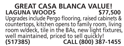 GREAT CASA BLANCA VALUE! LAGUNA WOODS $77,500 Upgrades include Pergo flooring, raised cabinets & countertops, kitchen opens to family room, living room w/deck, tile in the BAs, new light fixtures, well maintained, priced to sell quickly! (517385) CALL (800) 387-1455