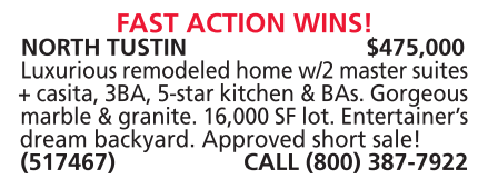 NORTH TUSTIN $475,000 Luxurious remodeled home w/2 master suites + casita, 3BA, 5-star kitchen & BAs. Gorgeous marble & granite. 16,000 SF lot. Entertainer’s dream backyard. Approved short sale! (517467) CALL (800) 387-7922