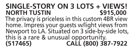 SINGLE-STORY ON 3 LOTS + VIEWS! NORTH TUSTIN $915,000 The privacy is priceless in this custom 4BR view home. Impress your guests w/light views from Newport to LA. Situated on 3 side-by-side lots, this is a rare & unusual opportunity. (517465) CALL (800) 387-7922