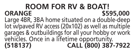 ROOM FOR RV & BOAT! ORANGE $595,000 Large 4BR, 3BA home situated on a double-deep lot w/paved RV access (20x102) as well as multiple garages & outbuildings for all your hobby or work vehicles. Once in a lifetime opportunity. (518137) CALL (800) 387-7922