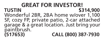 TUSTIN $314,900 Wonderful 2BR, 2BA home w/over 1,100 SF, cozy FP, private patio, 2-car attached garage & a great location. Just bring your paintbrush. (517653) CALL (800) 387-7930