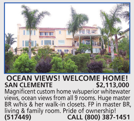 OCEAN VIEWS! WELCOME HOME! SAN CLEMENTE $2,113,000 Magnificent custom home w/superior whitewater views, ocean views from all 9 rooms. Huge master BR w/his & her walk-in closets. FP in master BR, living & family room. Pride of ownership! (517449) CALL (800) 387-1451