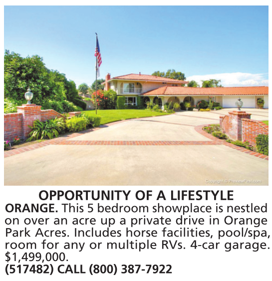 OPPORTUNITY OF A LIFESTYLE ORANGE. This 5 bedroom showplace is nestled on over an acre up a private drive in Orange Park Acres. Includes horse facilities, pool/spa, room for any or multiple RVs. 4-car garage. $1,499,000.