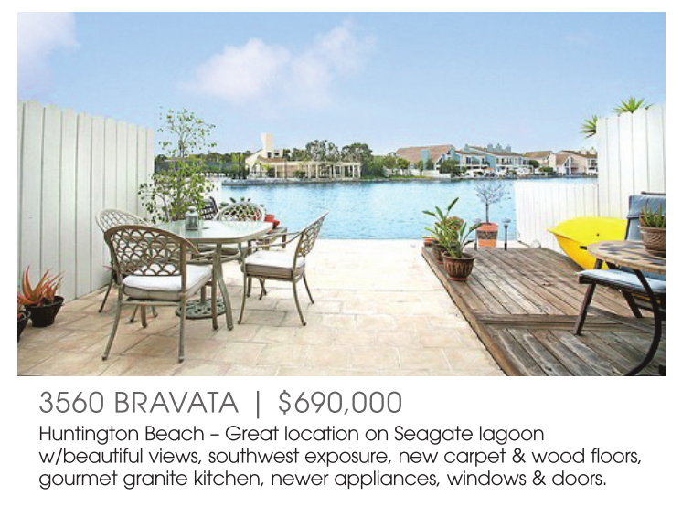 Huntington Beach – Great location on Seagate lagoon w/beautiful views, southwest exposure, new carpet & wood floors, gourmet granite kitchen, newer appliances, windows & doors.