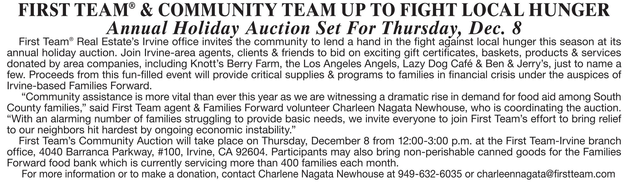 First Team’s Community Auction will take place on Thursday, December 8 from 12:00-3:00 p.m. at the First Team-Irvine branch office, 4040 Barranca Parkway, #100, Irvine, CA 92604. Participants may also bring non-perishable canned goods for the Families Forward food bank which is currently servicing more than 400 families each month.