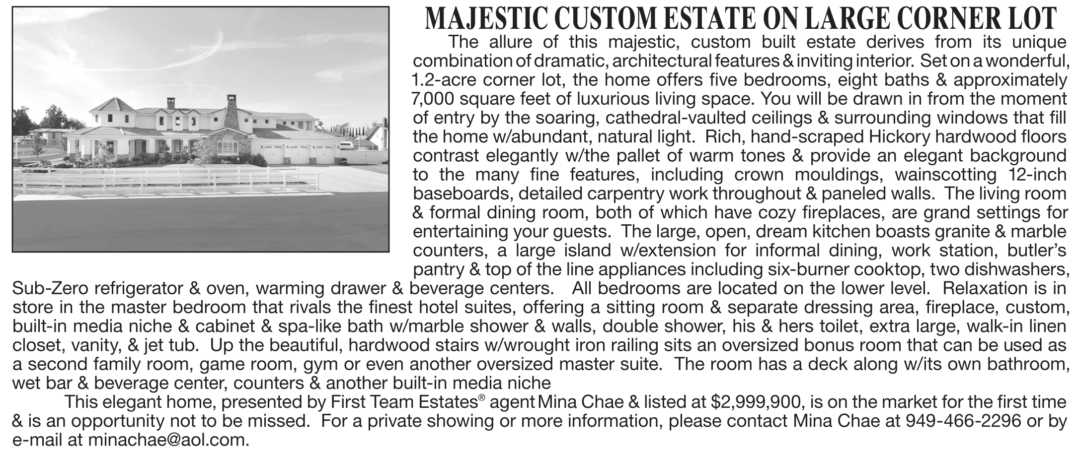 agentMina Chae & listed at $2,999,900, is on the market for the first time & is an opportunity not to be missed. For a private showing or more information, please contact Mina Chae at 949-466-2296 or by e-mail at minachae@aol.com.