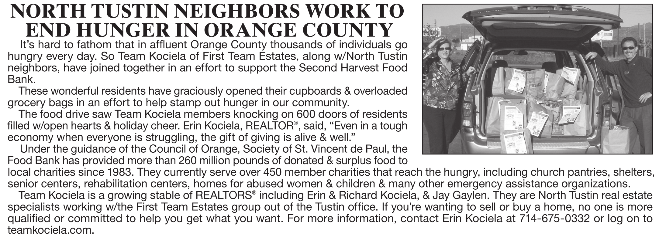 NORTH TUSTIN NEIGHBORS WORK TO END HUNGER IN ORANGE COUNTY It’s hard to fathom that in affluent Orange County thousands of individuals go hungry every day. So Team Kociela of First Team Estates, along w/North Tustin neighbors, have joined together in an effort to support the Second Harvest Food Bank. These wonderful residents have graciously opened their cupboards & overloaded grocery bags in an effort to help stamp out hunger in our community. The food drive saw Team Kociela members knocking on 600 doors of residents filled w/open hearts & holiday cheer. Erin Kociela, REALTOR ® , said, “Even in a tough economy when everyone is struggling, the gift of giving is alive & well.” Under the guidance of the Council of Orange, Society of St. Vincent de Paul, the Food Bank has provided more than 260 million pounds of donated & surplus food to local charities since 1983. They currently serve over 450 member charities that reach the hungry, including church pantries, shelters, senior centers, rehabilitation centers, homes for abused women & children & many other emergency assistance organizations. Team Kociela is a growing stable of REALTORS ® including Erin & Richard Kociela, & Jay Gaylen. They are North Tustin real estate specialists working w/the First Team Estates group out of the Tustin office. If you’re wanting to sell or buy a home, no one is more qualified or committed to help you get what you want. For more information, contact Erin Kociela at 714-675-0332 or log on to teamkociela.com.