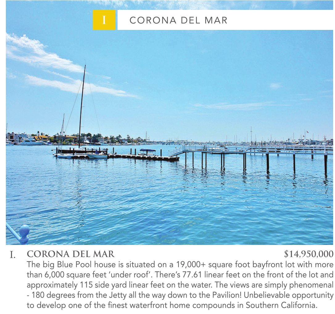I. CORONA DEL MAR $14,950,000 The big Blue Pool house is situated on a 19,000+ square foot bayfront lot with more than 6,000 square feet ‘under roof’. There’s 77.61 linear feet on the front of the lot and approximately 115 side yard linear feet on the water. The views are simply phenomenal - 180 degrees from the Jetty all the way down to the Pavilion! Unbelievable opportunity to develop one of the finest waterfront home compounds in Southern California.