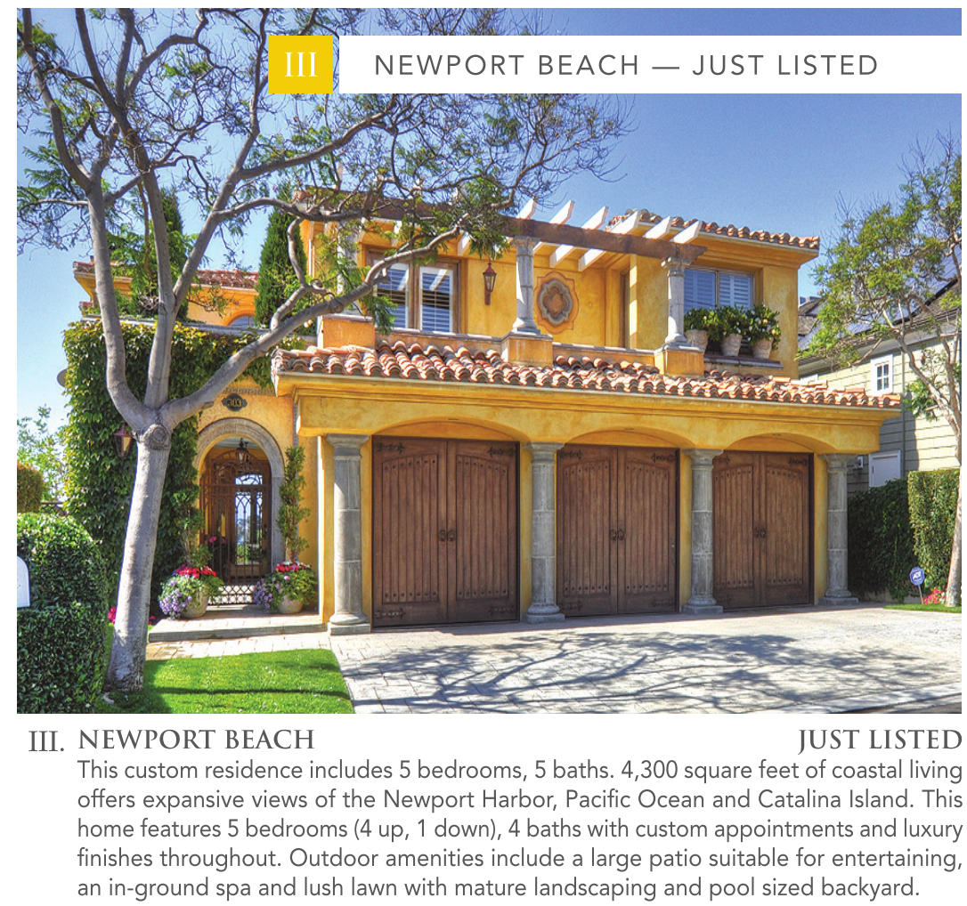 III NEWPORT BEACH — JUST LISTED III. NEWPORT BEACH JUST LISTED This custom residence includes 5 bedrooms, 5 baths. 4,300 square feet of coastal living offers expansive views of the Newport Harbor, Pacific Ocean and Catalina Island. This home features 5 bedrooms (4 up, 1 down), 4 baths with custom appointments and luxury finishes throughout. Outdoor amenities include a large patio suitable for entertaining, an in-ground spa and lush lawn with mature landscaping and pool sized backyard.