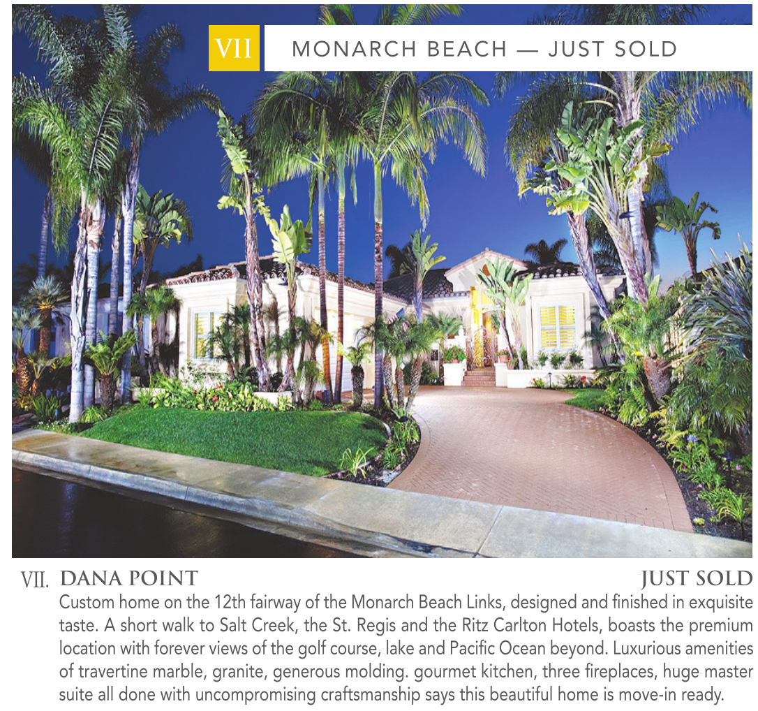 VII. DANA POINT JUST SOLD Custom home on the 12th fairway of the Monarch Beach Links, designed and finished in exquisite taste. A short walk to Salt Creek, the St. Regis and the Ritz Carlton Hotels, boasts the premium location with forever views of the golf course, lake and Pacific Ocean beyond. Luxurious amenities of travertine marble, granite, generous molding. gourmet kitchen, three fireplaces, huge master suite all done with uncompromising craftsmanship says this beautiful home is move-in ready.