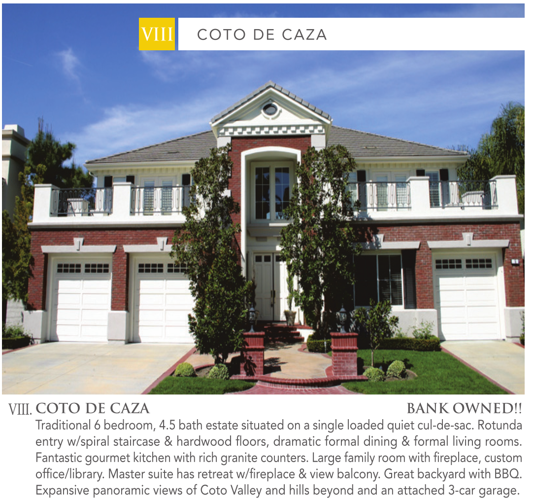 Traditional 6 bedroom, 4.5 bath estate situated on a single loaded quiet cul-de-sac. Rotunda entry w/spiral staircase & hardwood floors, dramatic formal dining & formal living rooms. Fantastic gourmet kitchen with rich granite counters. Large family room with fireplace, custom office/library. Master suite has retreat w/fireplace & view balcony. Great backyard with BBQ. Expansive panoramic views of Coto Valley and hills beyond and an attached 3-car garage.