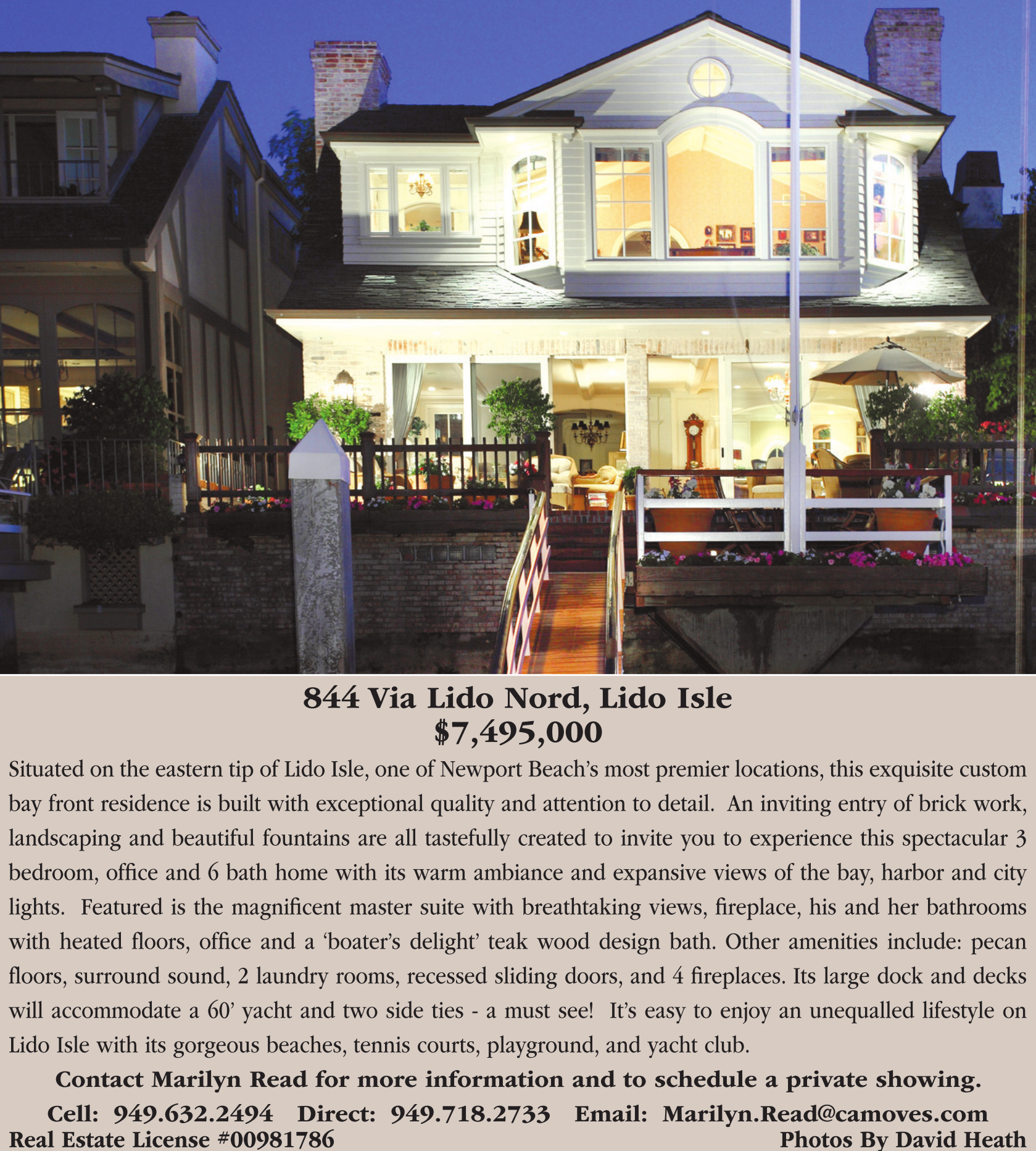 844 Via Lido Nord, Lido Isle $7,495,000 Situated on the eastern tip of Lido Isle, one of Newport Beach’s most premier locations, this exquisite custom bay front residence is built with exceptional quality and attention to detail. An inviting entry of brick work, landscaping and beautiful fountains are all tastefully created to invite you to experience this spectacular 3 bedroom, office and 6 bath home with its warm ambiance and expansive views of the bay, harbor and city lights. Featured is the magnificent master suite with breathtaking views, fireplace, his and her bathrooms with heated floors, office and a ‘boater’s delight’ teak wood design bath. Other amenities include: pecan floors, surround sound, 2 laundry rooms, recessed sliding doors, and 4 fireplaces. Its large dock and decks will accommodate a 60’ yacht and two side ties - a must see! It’s easy to enjoy an unequalled lifestyle on Lido Isle with its gorgeous beaches, tennis courts, playground, and yacht club. Contact Marilyn Read for more information and to schedule a private showing. Cell: 949.632.2494 Direct: 949.718.2733 Email: Marilyn.Read@camoves.com Real Estate License #00981786 Photos By David Heath