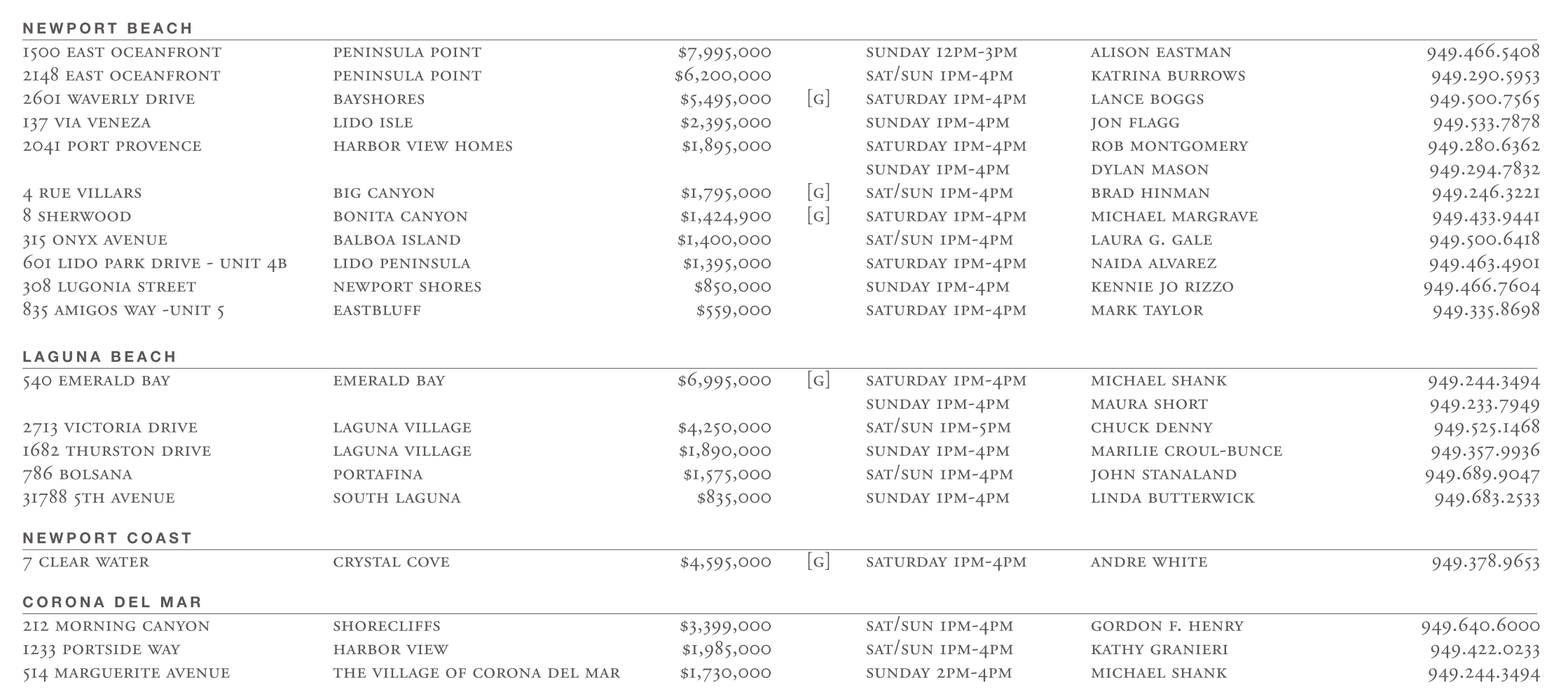 LAGUNA BEACH 540 emerald bay emerald bay $6,995,000 [g] saturday 1pm-4pm michael shank 949.244.3494 sunday 1pm-4pm maura short 949.233.7949 2713 victoria drive laguna village $4,250,000 sat/sun 1pm-5pm chuck denny 949.525.1468 1682 thurston drive laguna village $1,890,000 sunday 1pm-4pm marilie croul-bunce 949.357.9936 786 bolsana portafina $1,575,000 sat/sun 1pm-4pm john stanaland 949.689.9047 31788 5th avenue south laguna $835,000 sunday 1pm-4pm linda butterwick 949.683.2533 NEWPORT COAST 7 clear water crystal cove $4,595,000 [g] saturday 1pm-4pm andre white 949.378.9653