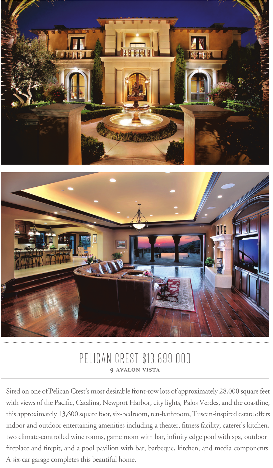 PELICAN CREST $13,899,000 9 avalon vista Sited on one of Pelican Crest’s most desirable front-row lots of approximately 28,000 square feet with views of the Pacific, Catalina, Newport Harbor, city lights, Palos Verdes, and the coastline, this approximately 13,600 square foot, six-bedroom, ten-bathroom, Tuscan-inspired estate offers indoor and outdoor entertaining amenities including a theater, fitness facility, caterer’s kitchen, two climate-controlled wine rooms, game room with bar, infinity edge pool with spa, outdoor fireplace and firepit, and a pool pavilion with bar, barbeque, kitchen, and media components. A six-car garage completes this beautiful home.