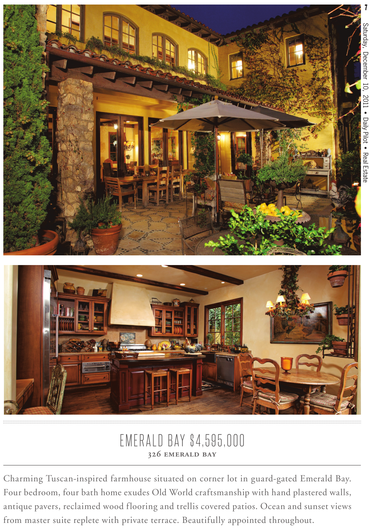 7 EMERALD BAY $4,595,000 326 emerald bay Charming Tuscan-inspired farmhouse situated on corner lot in guard-gated Emerald Bay. Four bedroom, four bath home exudes Old World craftsmanship with hand plastered walls, antique pavers, reclaimed wood flooring and trellis covered patios. Ocean and sunset views from master suite replete with private terrace. Beautifully appointed throughout.