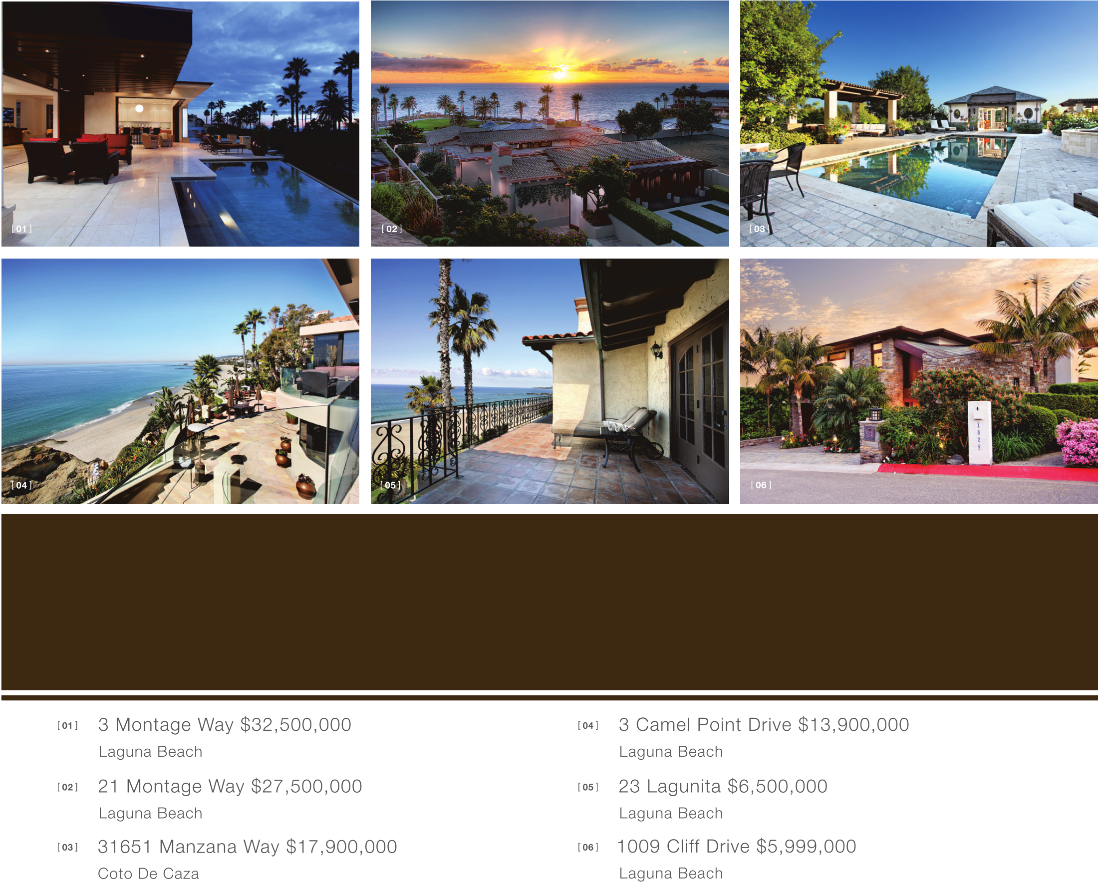 [ 01 ] [ 02 ] [ 03 ] [ 04 ] [ 05 ] [ 06 ] [ 01 ] [ 02 ] [ 03 ] 3 Montage Way $32,500,000 Laguna Beach 21 Montage Way $27,500,000 Laguna Beach 31651 Manzana Way $17,900,000 Coto De Caza [ 04 ] [ 05 ] [ 06 ] 3 Camel Point Drive $13,900,000 Laguna Beach 23 Lagunita $6,500,000 Laguna Beach 1009 Cliff Drive $5,999,000 Laguna Beach