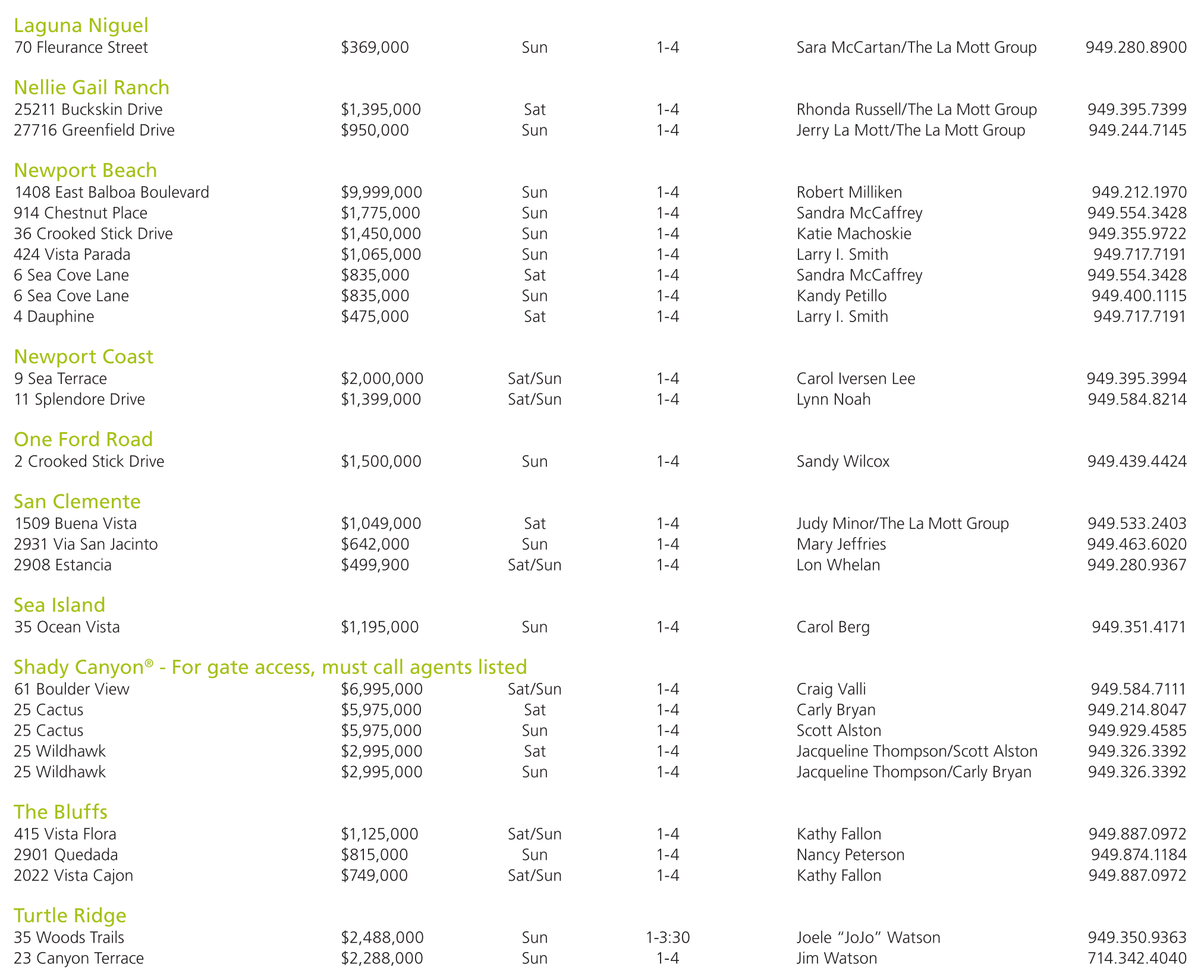 Laguna Niguel 70 Fleurance Street $369,000 Sun 1-4 Sara McCartan/The La Mott Group 949.280.8900 Nellie Gail Ranch 25211 Buckskin Drive $1,395,000 Sat 1-4 Rhonda Russell/The La Mott Group 949.395.7399 27716 Greenfield Drive $950,000 Sun 1-4 Jerry La Mott/The La Mott Group 949.244.7145 Newport Beach 1408 East Balboa Boulevard $9,999,000 Sun 1-4 Robert Milliken 949.212.1970 914 Chestnut Place $1,775,000 Sun 1-4 Sandra McCaffrey 949.554.3428 36 Crooked Stick Drive $1,450,000 Sun 1-4 Katie Machoskie 949.355.9722 424 Vista Parada $1,065,000 Sun 1-4 Larry I. Smith 949.717.7191 6 Sea Cove Lane $835,000 Sat 1-4 Sandra McCaffrey 949.554.3428 6 Sea Cove Lane $835,000 Sun 1-4 Kandy Petillo 949.400.1115 4 Dauphine $475,000 Sat 1-4 Larry I. Smith 949.717.7191 Newport Coast 9 Sea Terrace $2,000,000 Sat/Sun 1-4 Carol Iversen Lee 949.395.3994 11 Splendore Drive $1,399,000 Sat/Sun 1-4 Lynn Noah 949.584.8214 One Ford Road 2 Crooked Stick Drive $1,500,000 Sun 1-4 Sandy Wilcox 949.439.4424 San Clemente 1509 Buena Vista $1,049,000 Sat 1-4 Judy Minor/The La Mott Group 949.533.2403 2931 Via San Jacinto $642,000 Sun 1-4 Mary Jeffries 949.463.6020 2908 Estancia $499,900 Sat/Sun 1-4 Lon Whelan 949.280.9367 Sea Island 35 Ocean Vista $1,195,000 Sun 1-4 Carol Berg 949.351.4171 Shady Canyon ® - For gate access, must call agents listed 61 Boulder View $6,995,000 Sat/Sun 1-4 Craig Valli 949.584.7111 25 Cactus $5,975,000 Sat 1-4 Carly Bryan 949.214.8047 25 Cactus $5,975,000 Sun 1-4 Scott Alston 949.929.4585 25 Wildhawk $2,995,000 Sat 1-4 Jacqueline Thompson/Scott Alston 949.326.3392 25 Wildhawk $2,995,000 Sun 1-4 Jacqueline Thompson/Carly Bryan 949.326.3392 The Bluffs 415 Vista Flora $1,125,000 Sat/Sun 1-4 Kathy Fallon 949.887.0972 2901 Quedada $815,000 Sun 1-4 Nancy Peterson 949.874.1184 2022 Vista Cajon $749,000 Sat/Sun 1-4 Kathy Fallon 949.887.0972 Turtle Ridge 35 Woods Trails $2,488,000 Sun 1-3:30 Joele “JoJo” Watson 949.350.9363 23 Canyon Terrace $2,288,000 Sun 1-4 Jim Watson 714.342.4040