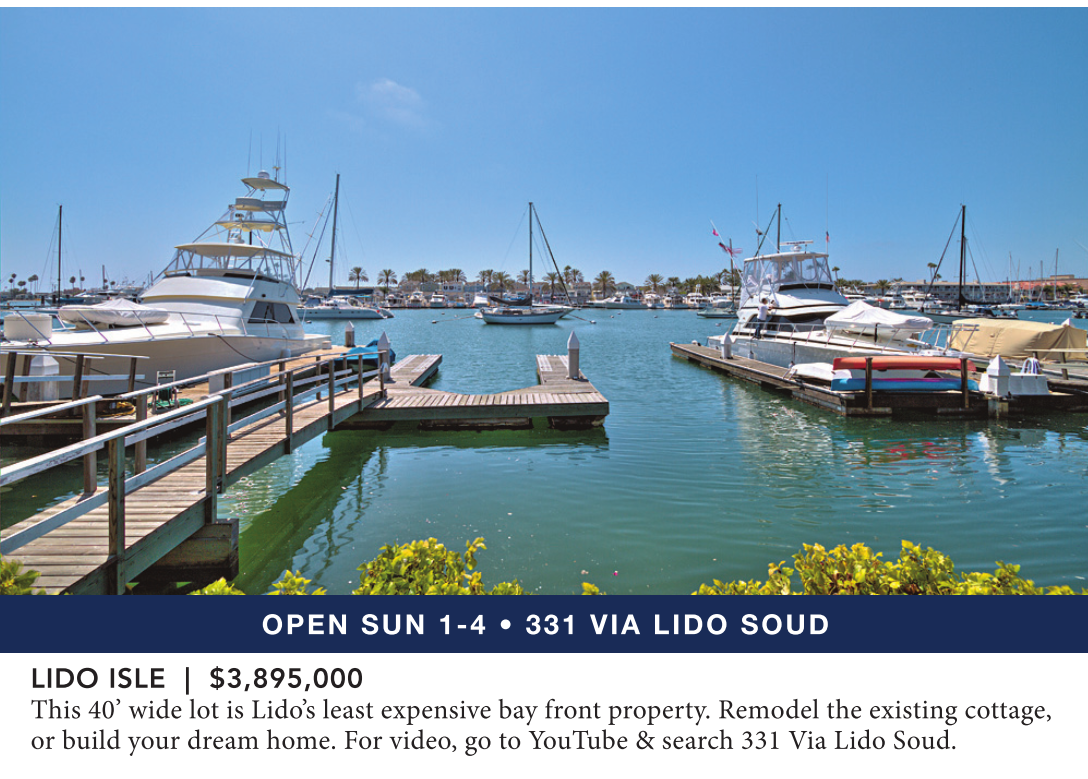LIDO ISLE | $3,895,000 This 40’ wide lot is Lido’s least expensive bay front property. Remodel the existing cottage, or build your dream home. For video, go to YouTube & search 331 Via Lido Soud.
