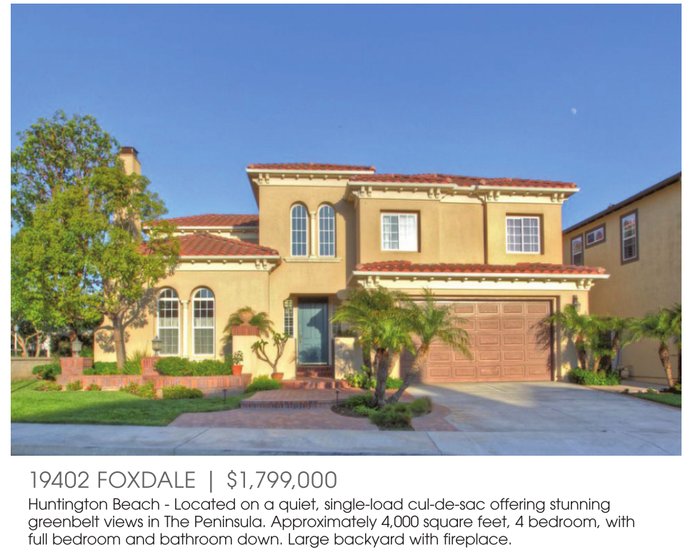 19402 FOXDALE | $1,799,000 Huntington Beach - Located on a quiet, single-load cul-de-sac offering stunning greenbelt views in The Peninsula. Approximately 4,000 square feet, 4 bedroom, with full bedroom and bathroom down. Large backyard with fireplace.