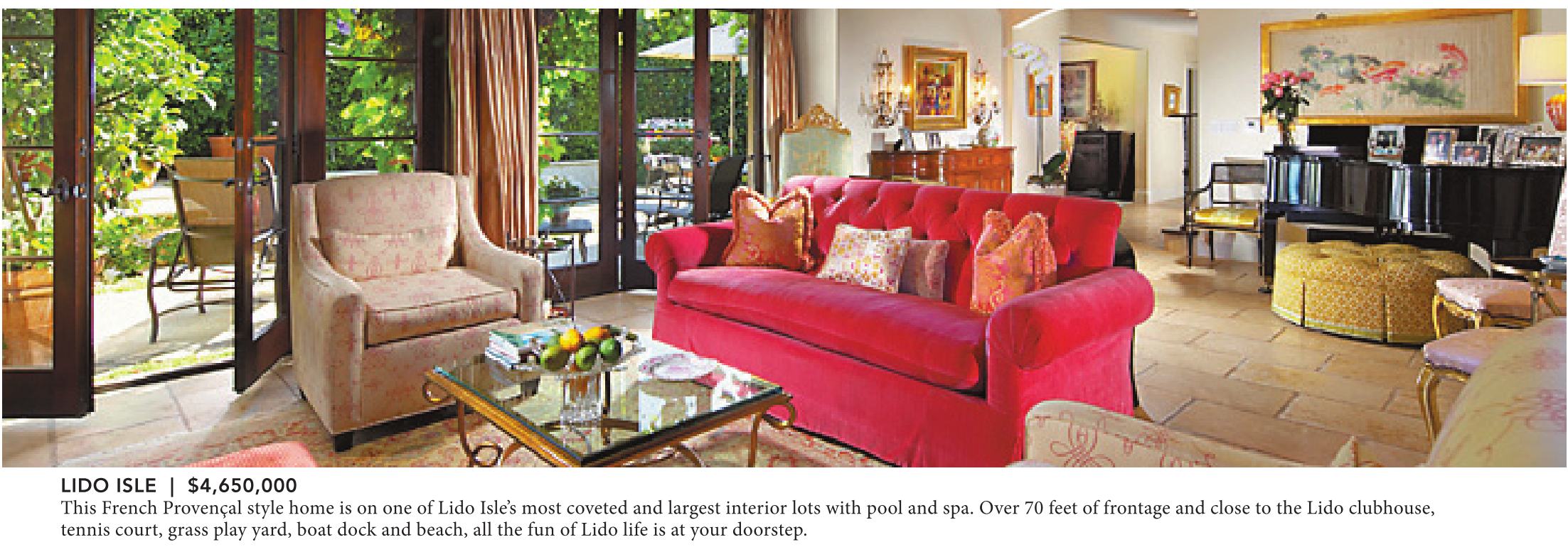 LIDO ISLE | $4,650,000 This French Provençal style home is on one of Lido Isle’s most coveted and largest interior lots with pool and spa. Over 70 feet of frontage and close to the Lido clubhouse, tennis court, grass play yard, boat dock and beach, all the fun of Lido life is at your doorstep.