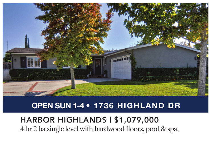 HARBOR HIGHLANDS | $1,079,000 4 br 2 ba single level with hardwood floors, pool & spa.