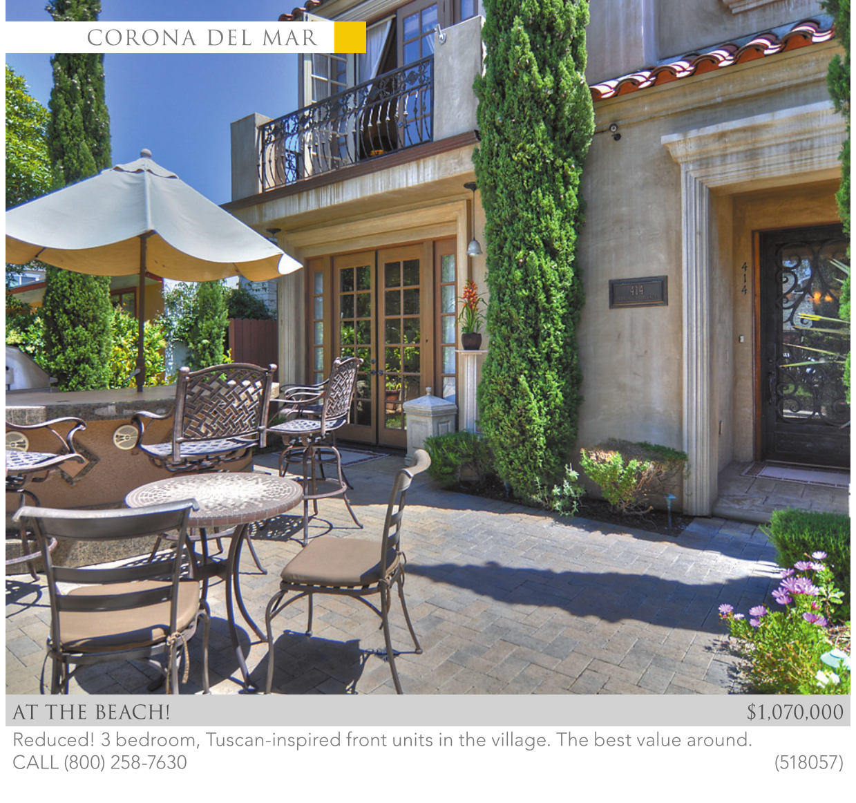 AT THE BEACH! $1,070,000 Reduced! 3 bedroom, Tuscan-inspired front units in the village. The best value around. CALL (800) 258-7630 (518057)
