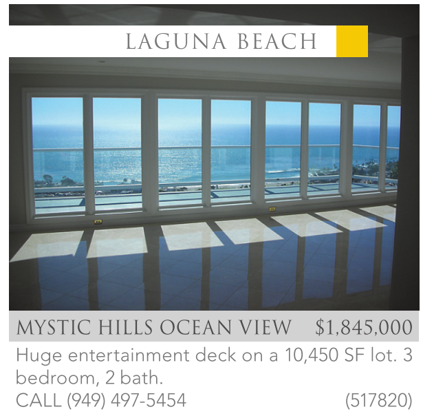 MYSTIC HILLS OCEAN VIEW $1,845,000 Huge entertainment deck on a 10,450 SF lot. 3 bedroom, 2 bath. CALL (949) 497-5454 (517820)