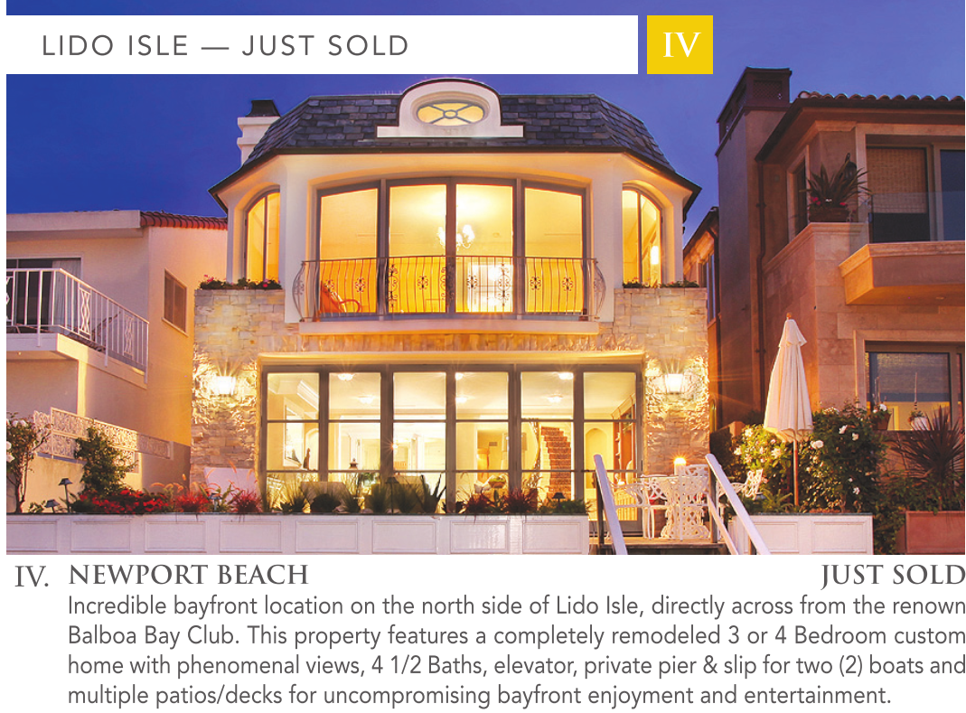 LIDO ISLE — JUST SOLD IV patio IV. NEWPORT BEACH JUST SOLD Incredible bayfront location on the north side of Lido Isle, directly across from the renown Balboa Bay Club. This property features a completely remodeled 3 or 4 Bedroom custom home with phenomenal views, 4 1/2 Baths, elevator, private pier & slip for two (2) boats and multiple patios/decks for uncompromising bayfront enjoyment and entertainment.