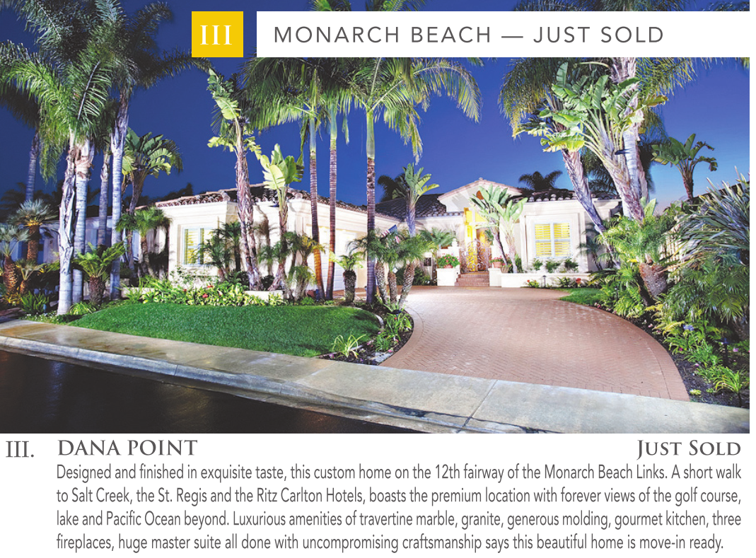 III MONARCH BEACH — JUST SOLD III. DANA POINT Just Sold Designed and finished in exquisite taste, this custom home on the 12th fairway of the Monarch Beach Links. A short walk to Salt Creek, the St. Regis and the Ritz Carlton Hotels, boasts the premium location with forever views of the golf course, lake and Pacific Ocean beyond. Luxurious amenities of travertine marble, granite, generous molding, gourmet kitchen, three fireplaces, huge master suite all done with uncompromising craftsmanship says this beautiful home is move-in ready.