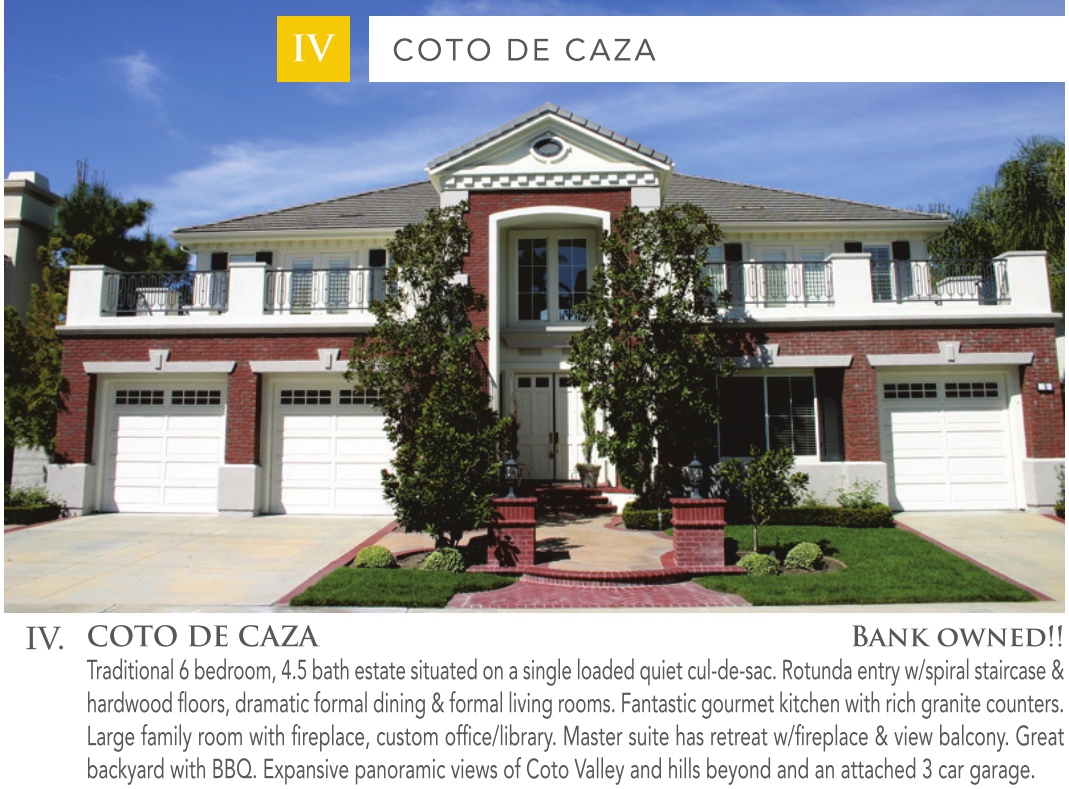 IV COTO DE CAZA IV. COTO DE CAZA Bank owned!! Traditional 6 bedroom, 4.5 bath estate situated on a single loaded quiet cul-de-sac. Rotunda entry w/spiral staircase & hardwood floors, dramatic formal dining & formal living rooms. Fantastic gourmet kitchen with rich granite counters. Large family room with fireplace, custom office/library. Master suite has retreat w/fireplace & view balcony. Great backyard with BBQ. Expansive panoramic views of Coto Valley and hills beyond and an attached 3 car garage.