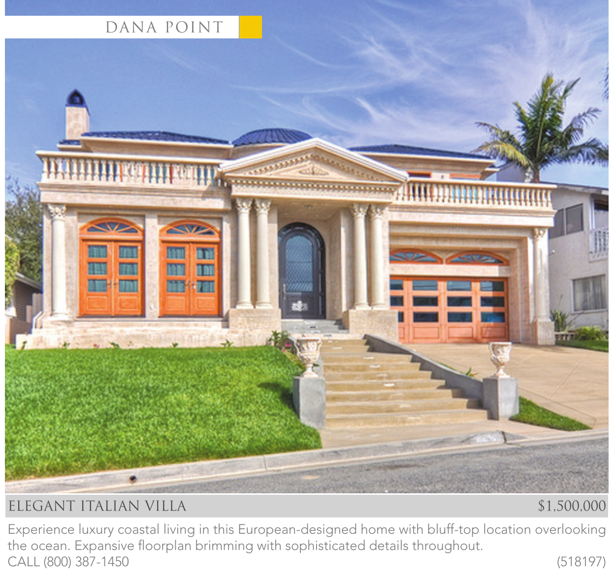 DANA POINT ELEGANT ITALIAN VILLA $1,500,000 Experience luxury coastal living in this European-designed home with bluff-top location overlooking the ocean. Expansive floorplan brimming with sophisticated details throughout. CALL (800) 387-1450 (518197)
