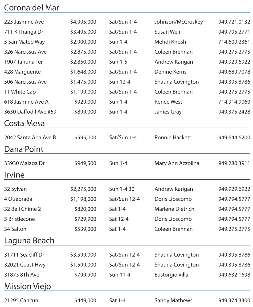 223 Jasmine Ave $4,995,000 Sat/Sun 1-4 Johnson/McCroskey 949.721.0132 711 K Thanga Dr $3,495,000 Sat/Sun 1-4 Susan Weir 949.795.2771 5 San Mateo Way $2,900,000 Sun 1-4 Mehdi Khosh 714.609.2361 326 Narcissus Ave $2,875,000 Sat/Sun 1-4 Coleen Brennan 949.275.2775 1907 Tahuna Ter $2,850,000 Sun 1-5 Andrew Karigan 949.929.6922 428 Marguerite $1,648,000 Sat/Sun 1-4 Denine Kerns 949.689.7078 506 Narcissus Ave $1.475.000 Sun 12-4 Shauna Covington 949.395.8786 11 White Cap $1,199,000 Sat/Sun 1-4 Coleen Brennan 949.275.2775 618 Jasmine Ave A $929,000 Sun 1-4 Renee West 714.914.9060 3630 Daffodil Ave #69 $899,000 Sun 1-4 James Gray 949.375.2428