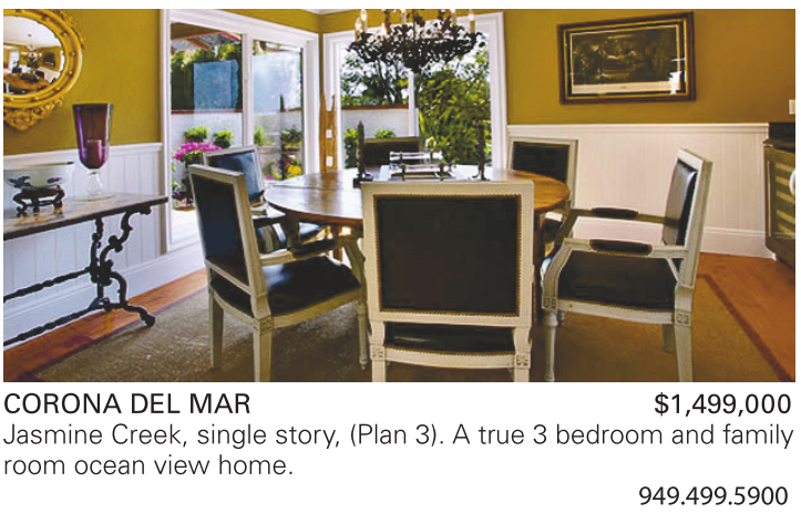 CORONA DEL MAR $1,499,000 Jasmine Creek, single story, (Plan 3). A true 3 bedroom and family room ocean view home.