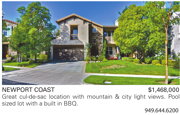 NEWPORT COAST $1,468,000 Great cul-de-sac location with mountain & city light views. Pool sized lot with a built in BBQ.