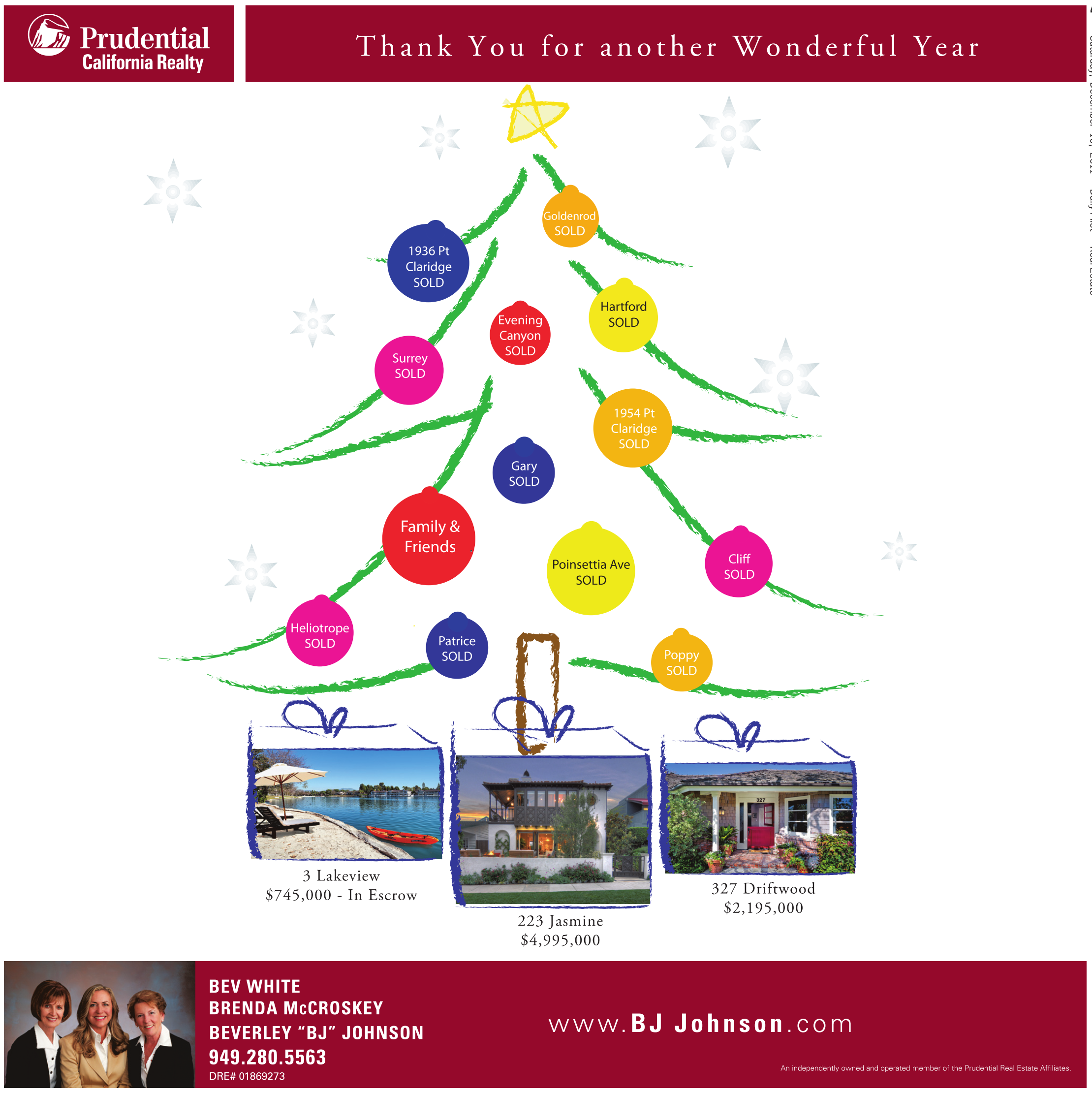 T h a n k Y o u f o r a n o t h e r W o n d e r f u l Y e a r 1936 Pt Claridge SOLD Surrey SOLD Evening Canyon SOLD Goldenrod SOLD Hartford SOLD 43 Gary SOLD 1954 Pt Claridge SOLD Family & Friends Poinsettia Ave SOLD Cliff SOLD Heliotrope SOLD Patrice SOLD Poppy SOLD 3 Lakeview $745,000 - In Escrow 223 Jasmine $4,995,000 327 Driftwood $2,195,000 BEV WHITE BRENDA MCCROSKEY BEVERLEY “BJ” JOHNSON 949.280.5563 DRE# 01869273 w w w. B J J o h n s o n . c o m An independently owned and operated member of the Prudential Real Estate Affiliates.
