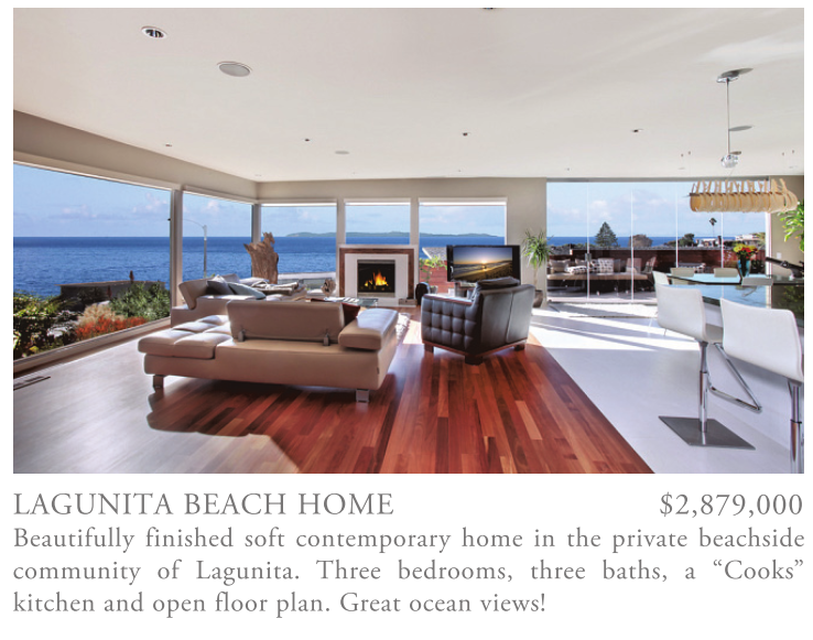 LAGUNITA BEACH HOME $2,879,000 Beautifully finished soft contemporary home in the private beachside community of Lagunita. Three bedrooms, three baths, a “Cooks” kitchen and open floor plan. Great ocean views!