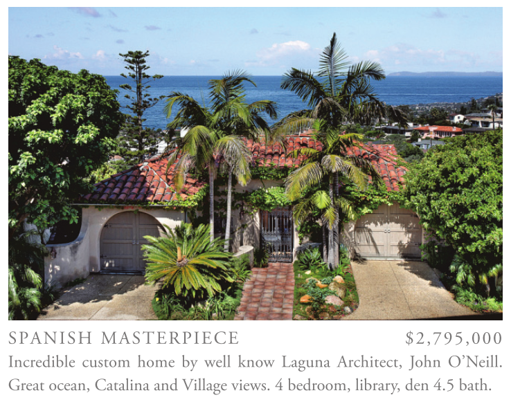 SPANISH MASTERPIECE $2,795,000 Incredible custom home by well know Laguna Architect, John O’Neill. Great ocean, Catalina and Village views. 4 bedroom, library, den 4.5 bath.