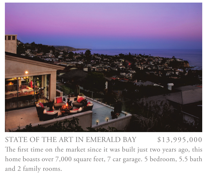 STATE OF THE ART IN EMERALD BAY $13,995,000 The first time on the market since it was built just two years ago, this home boasts over 7,000 square feet, 7 car garage. 5 bedroom, 5.5 bath and 2 family rooms.