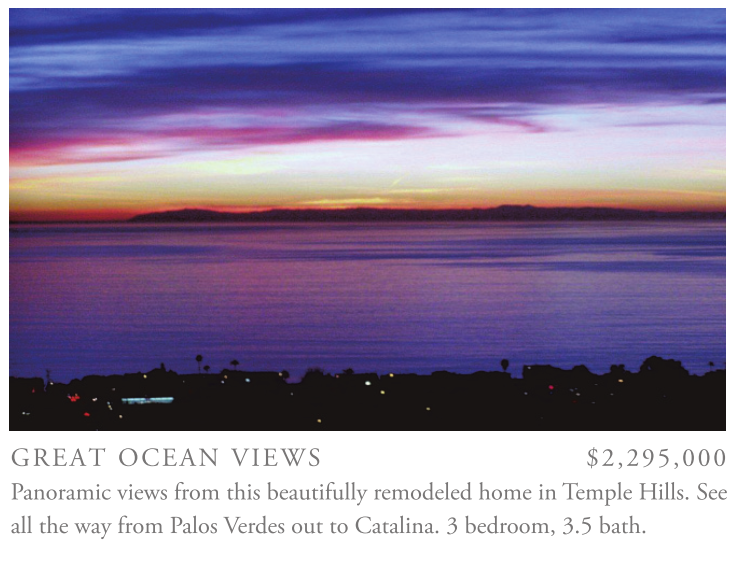 GREAT OCEAN VIEWS $2,295,000 Panoramic views from this beautifully remodeled home in Temple Hills. See all the way from Palos Verdes out to Catalina. 3 bedroom, 3.5 bath.