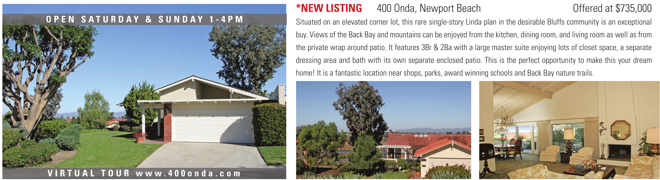 O P E N S AT U R D A Y & S U N D A Y 1 - 4 P M *NEW LISTING 400 Onda, Newport Beach Offered at $735,000 Situated on an elevated corner lot, this rare single-story Linda plan in the desirable Bluffs community is an exceptional buy. Views of the Back Bay and mountains can be enjoyed from the kitchen, dining room, and living room as well as from the private wrap around patio. It features 3Br & 2Ba with a large master suite enjoying lots of closet space, a separate dressing area and bath with its own separate enclosed patio. This is the perfect opportunity to make this your dream home! It is a fantastic location near shops, parks, award winning schools and Back Bay nature trails. V I R T U A L T O U R w w w . 4 0 0 o n d a . c o m