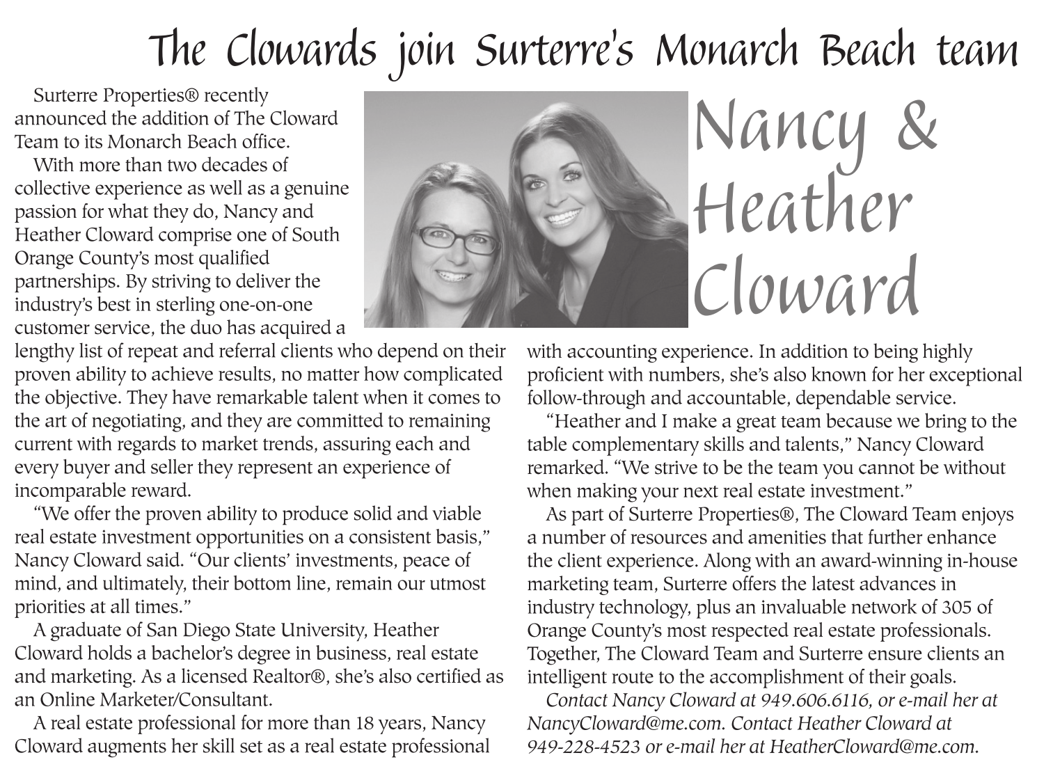 Contact Nancy Cloward at 949.606.6116, or e-mail her at NancyCloward@me.com. Contact Heather Cloward at 949-228-4523 or e-mail her at HeatherCloward@me.com.